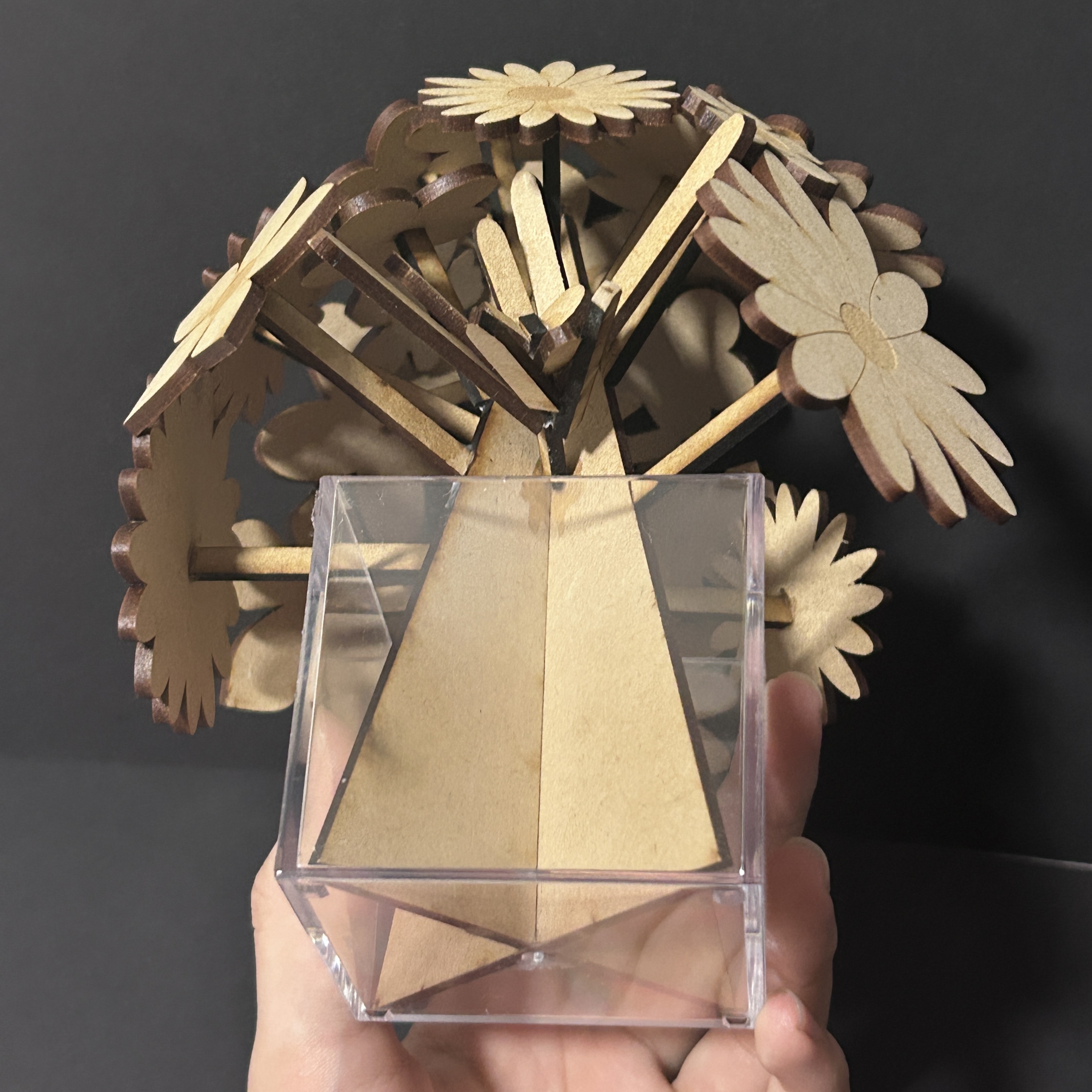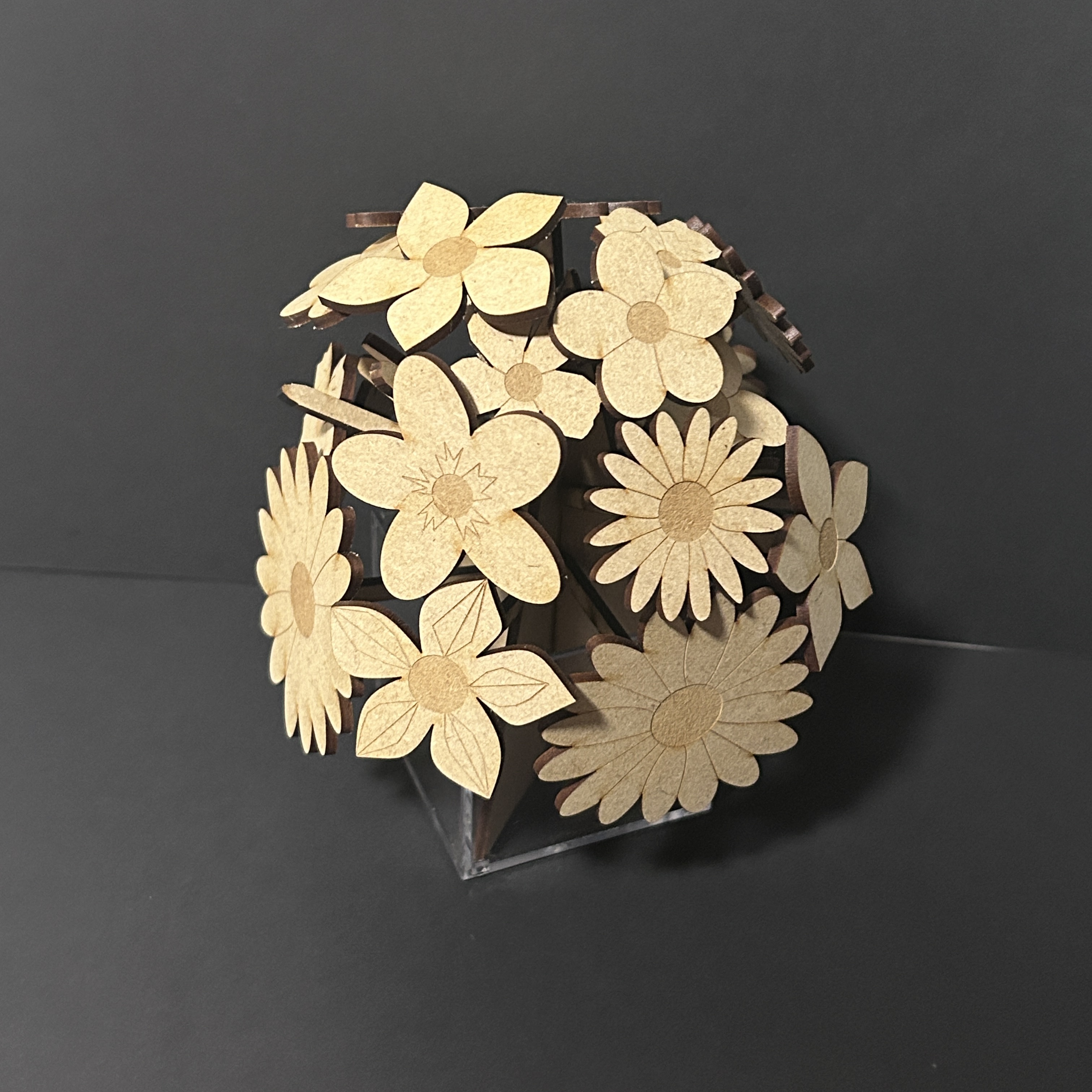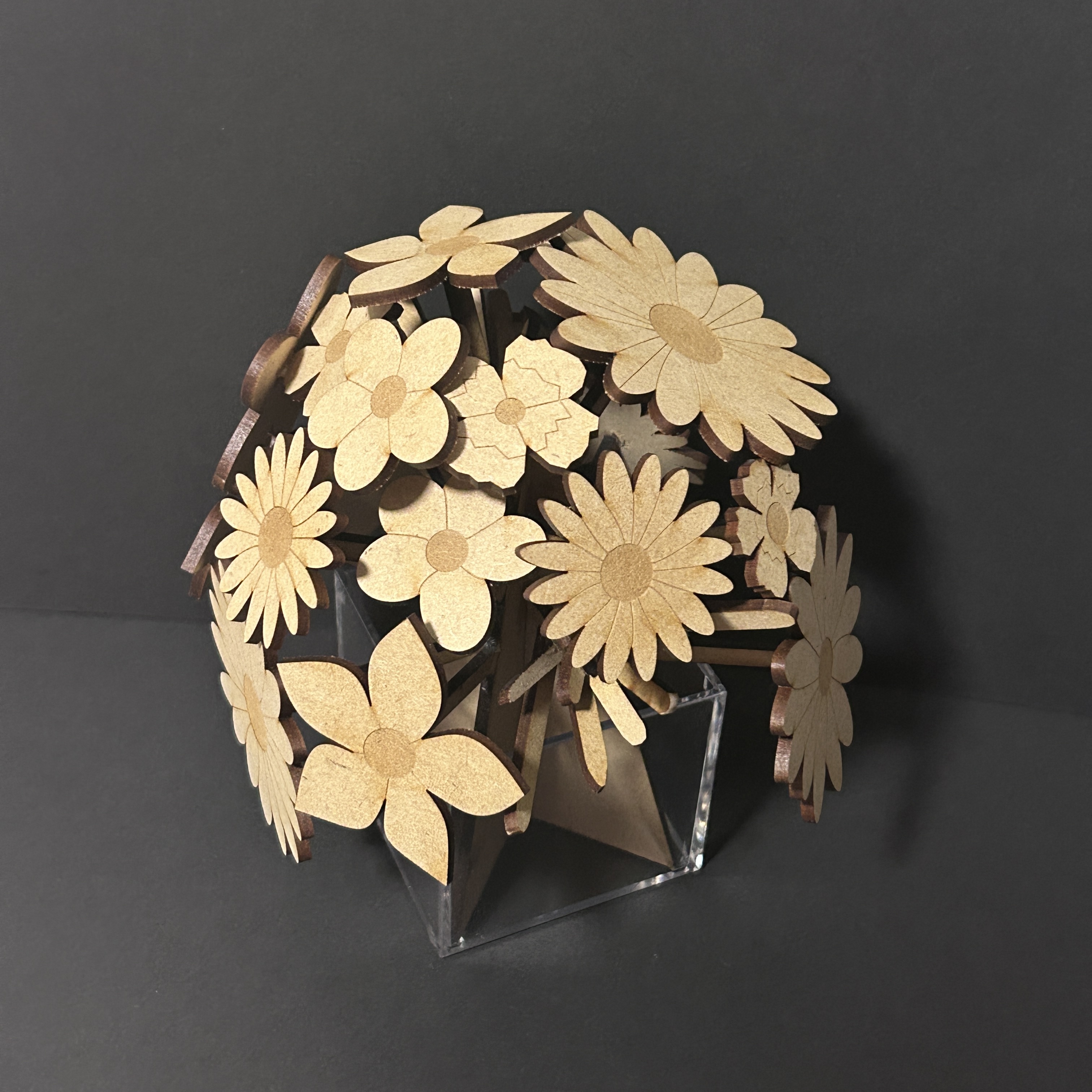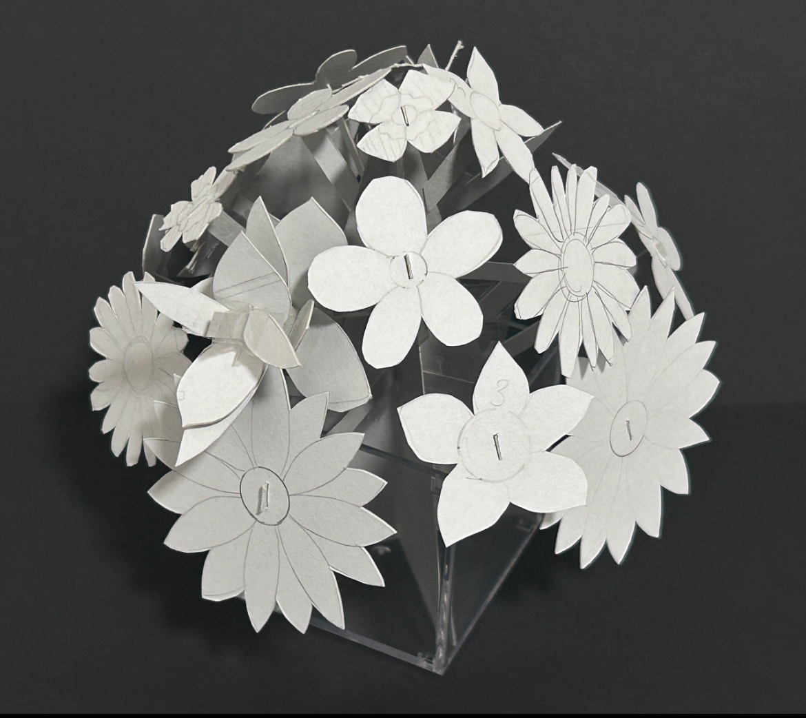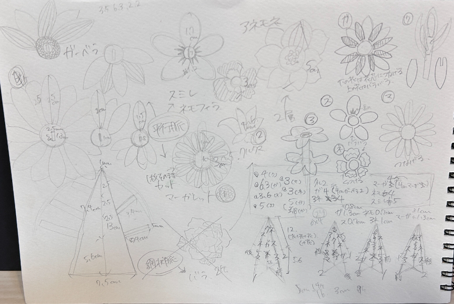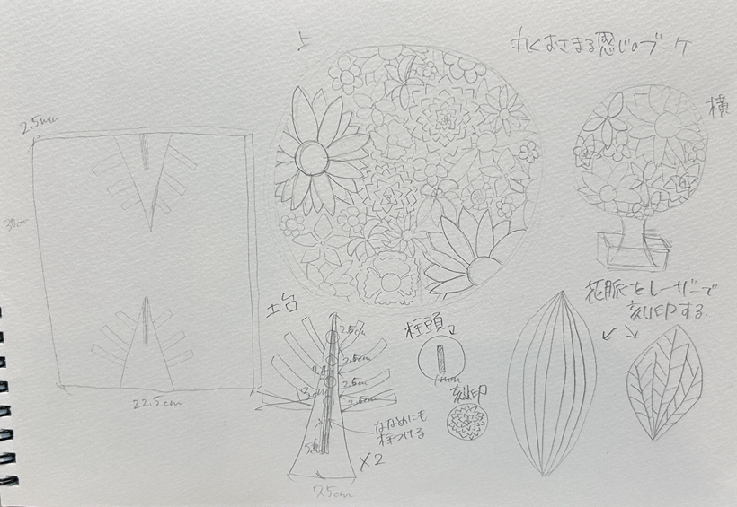 動機:生花は色鮮やかで綺麗な反面、すぐ枯れてしまう点、虫が寄ってくるという点で日常生活に取り入れにくいという面があるため花束を木にすることでより多くの人が花に触れられるのではないかと考えた。また最近はシンプルなデザインの部屋が多いため木の茶色で統一感を持たせることができるのではないかと考えた。